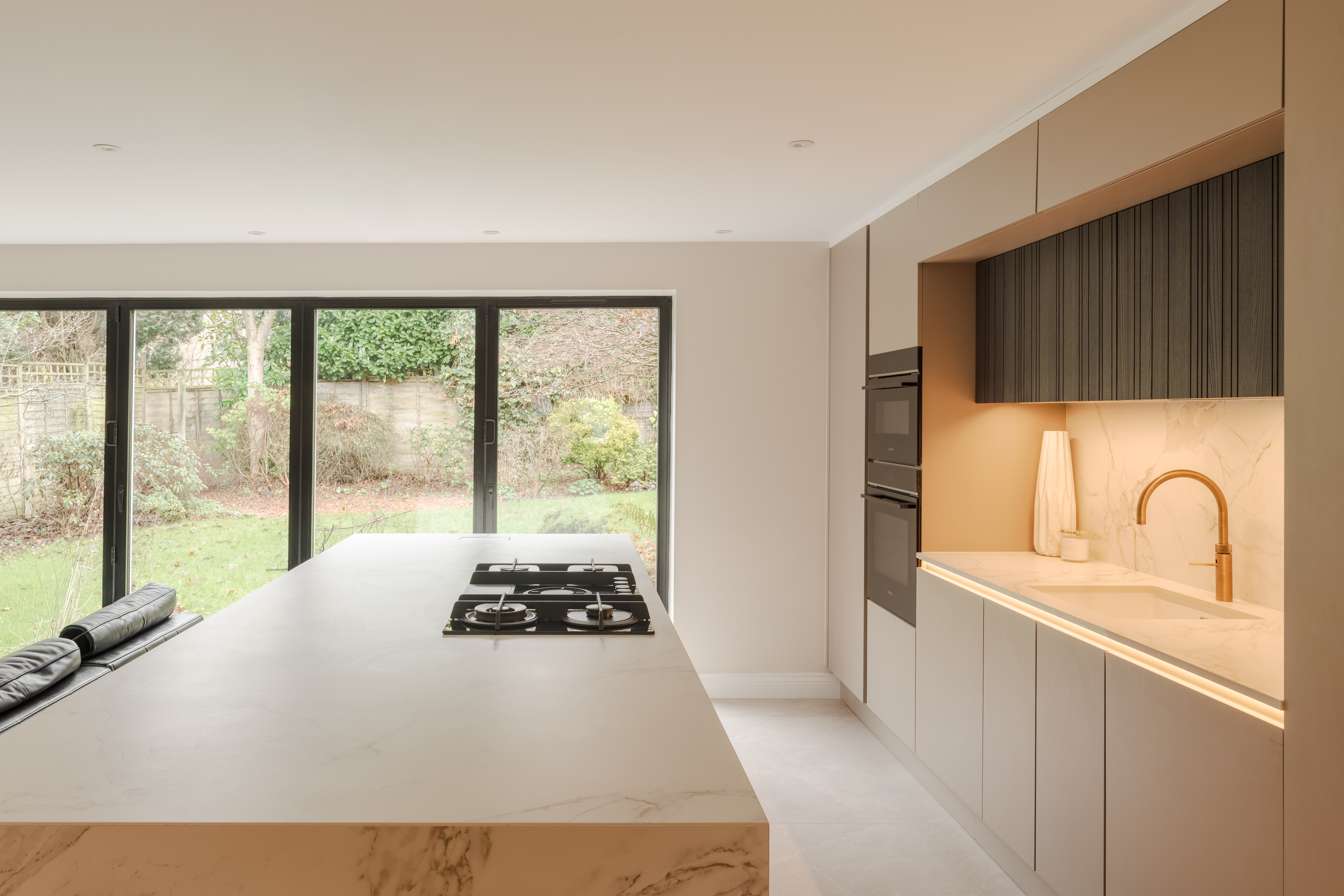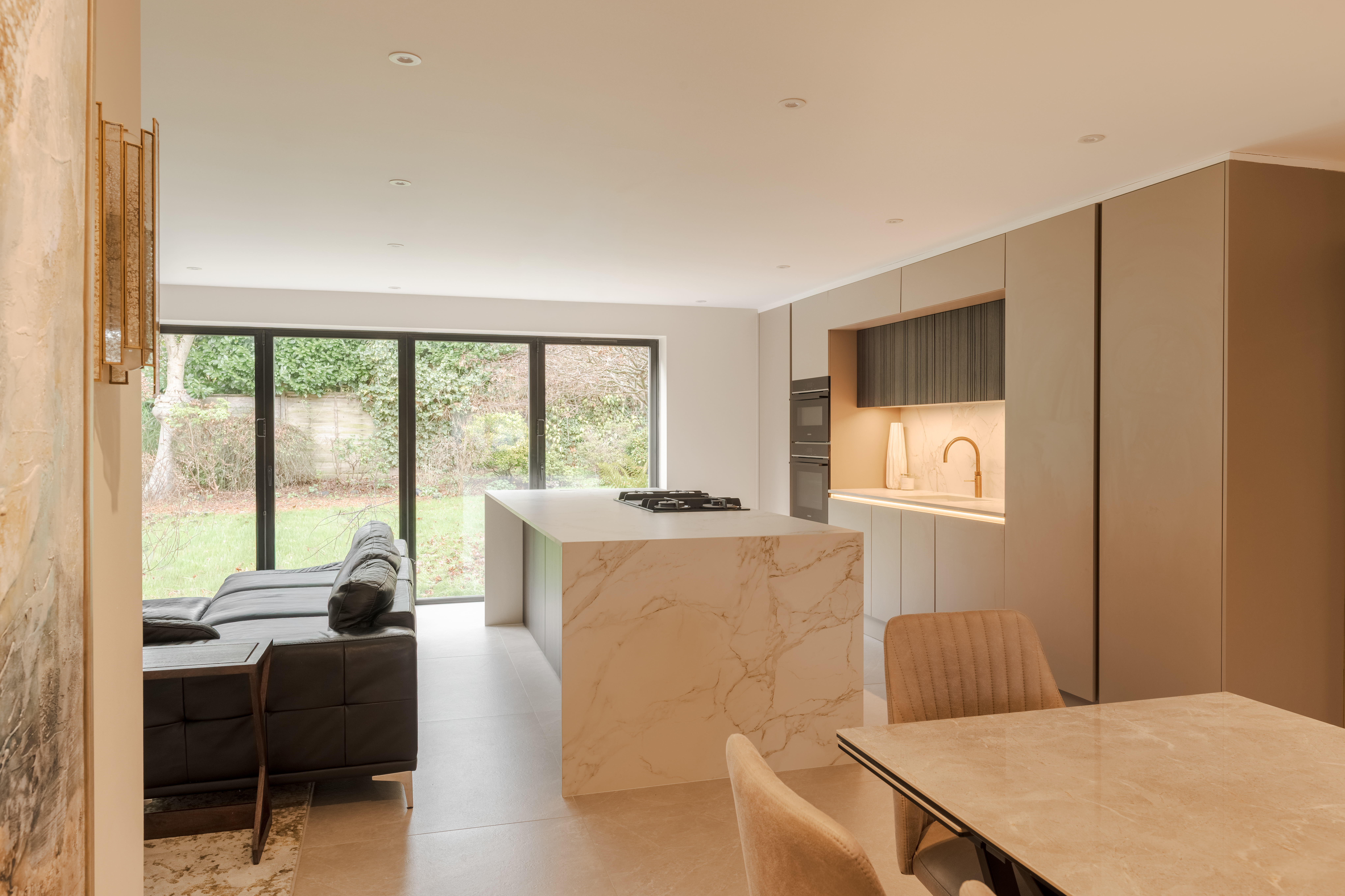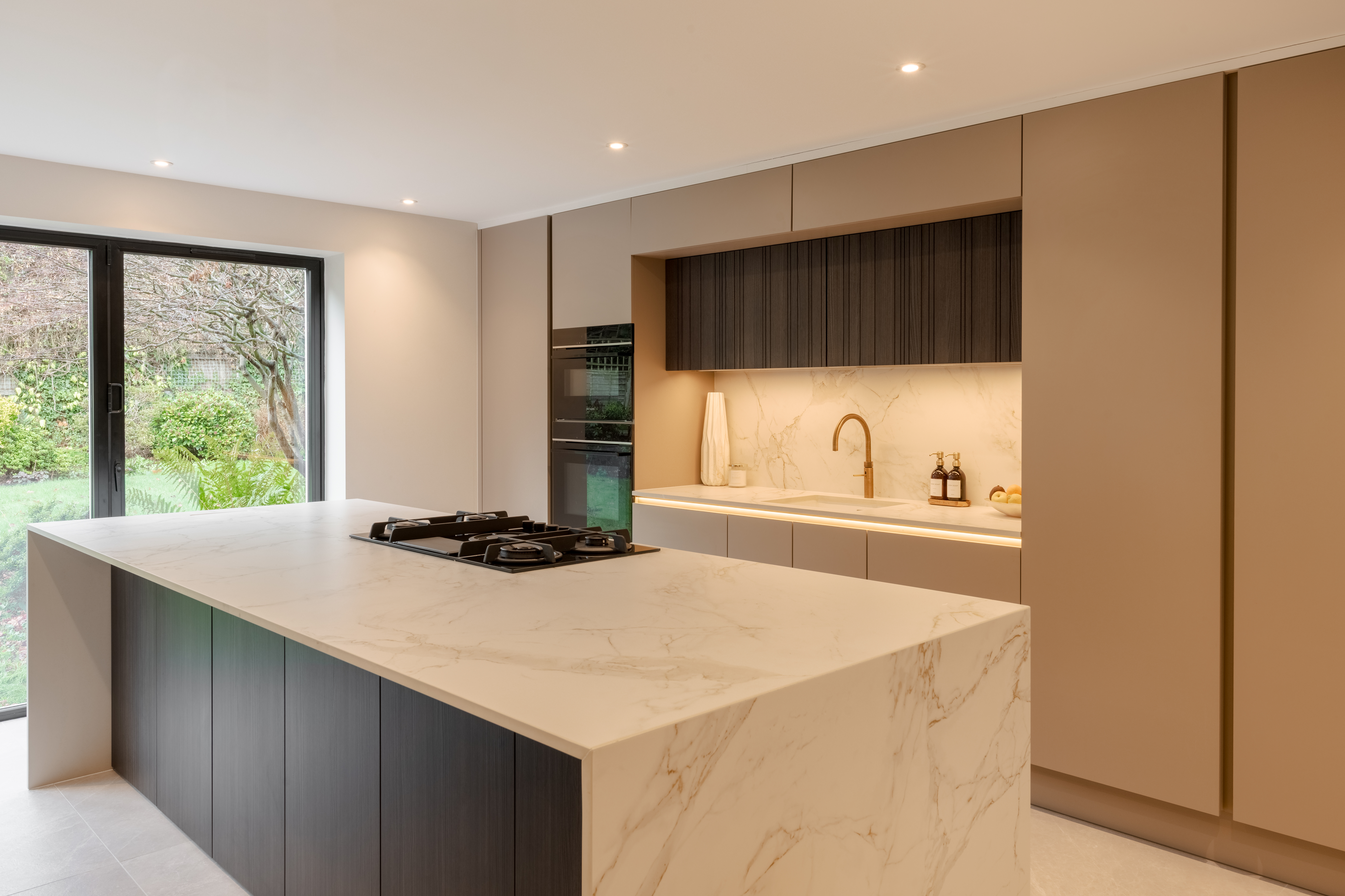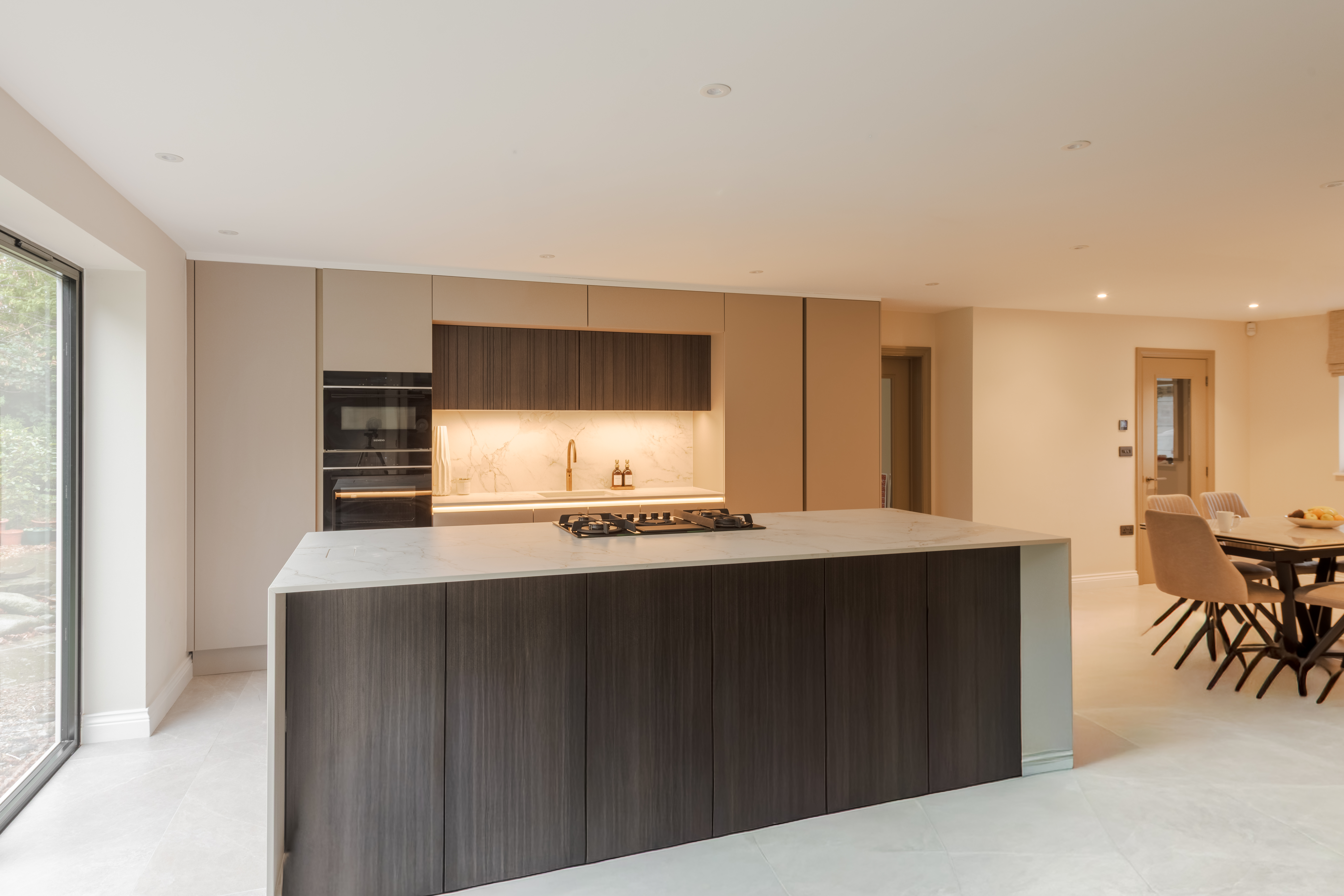 The Dekton Entzo worktop elevates the design with its subtle stone-inspired patterns and durable, low-maintenance surface, providing both visual interest and enduring practicality for everyday use.