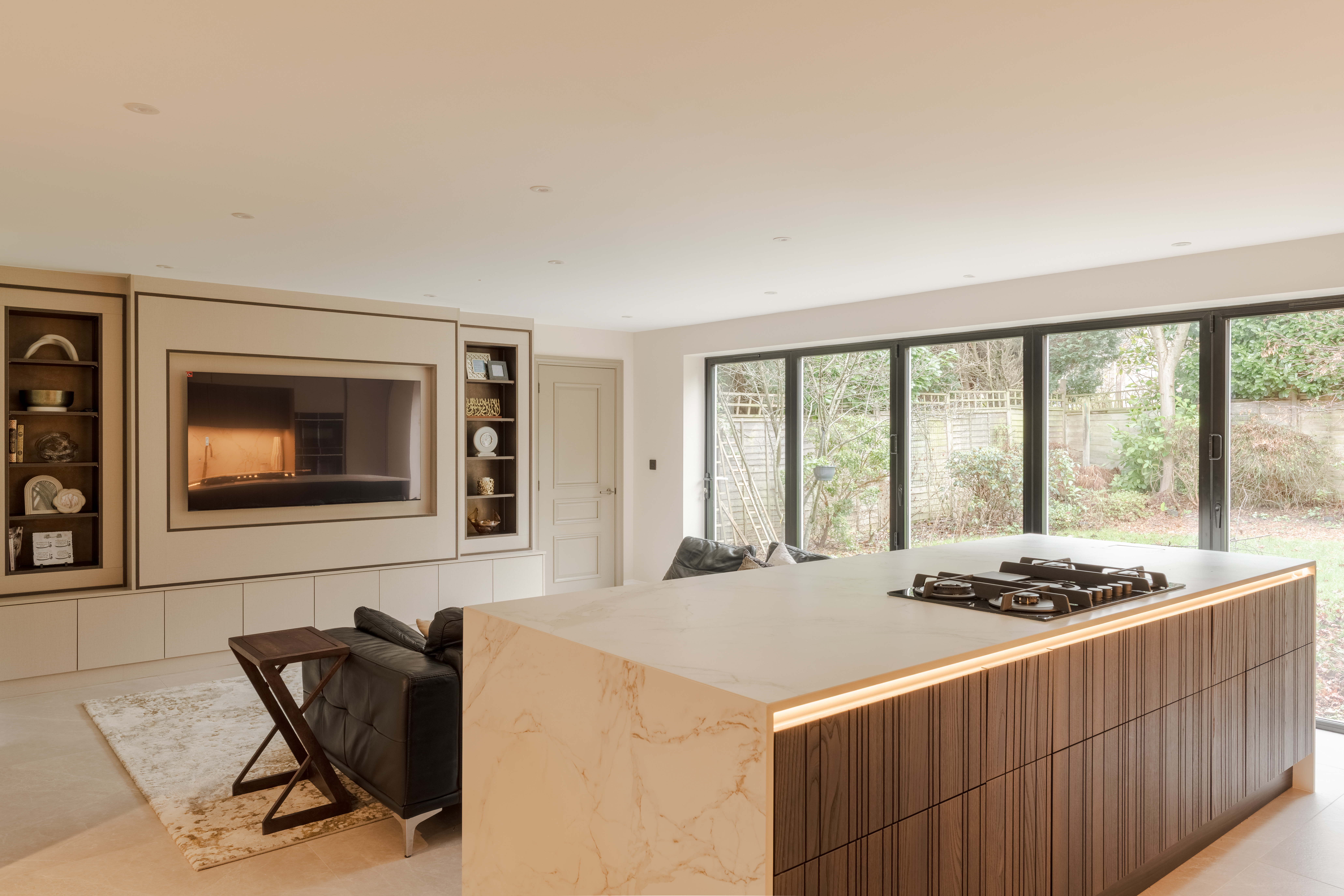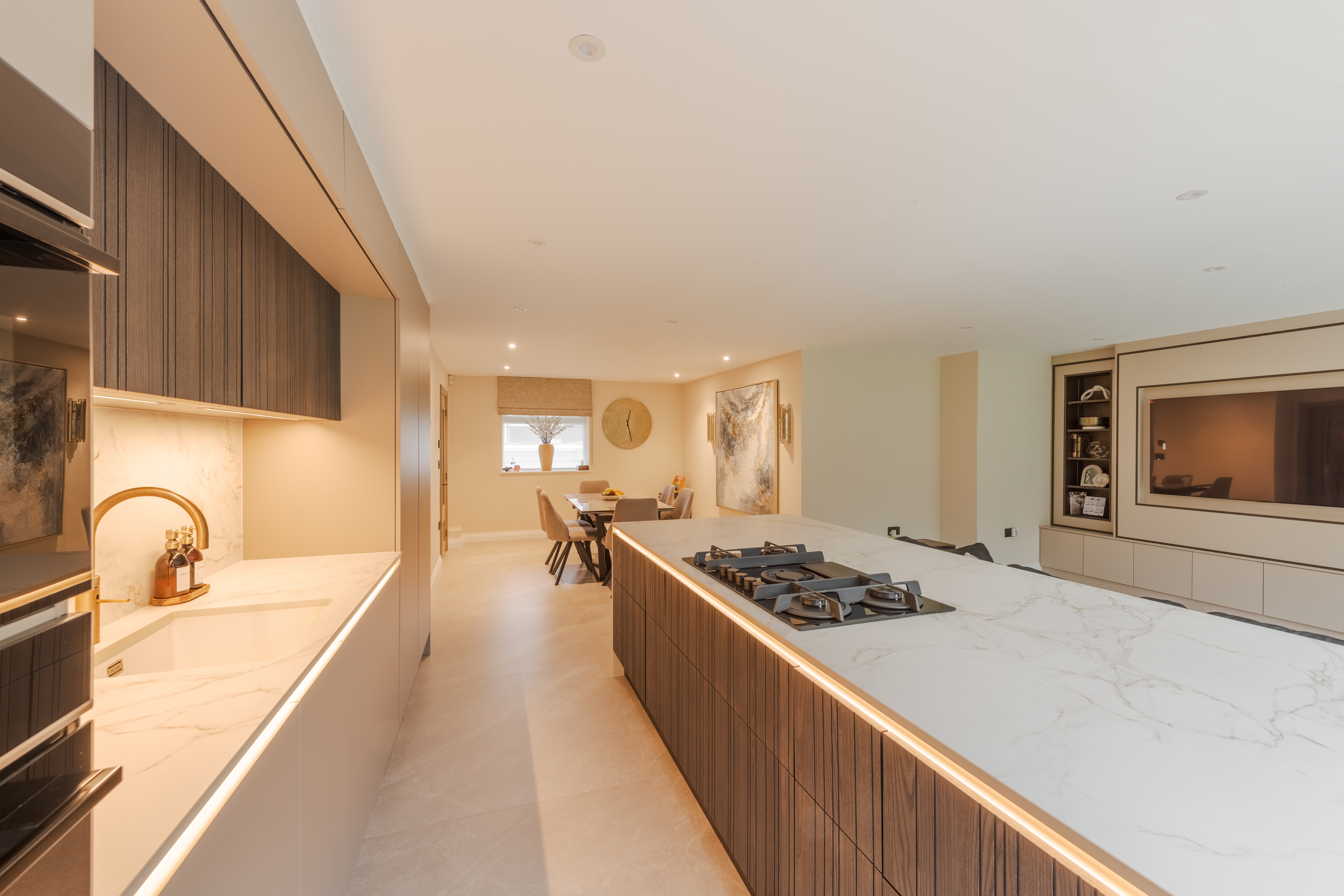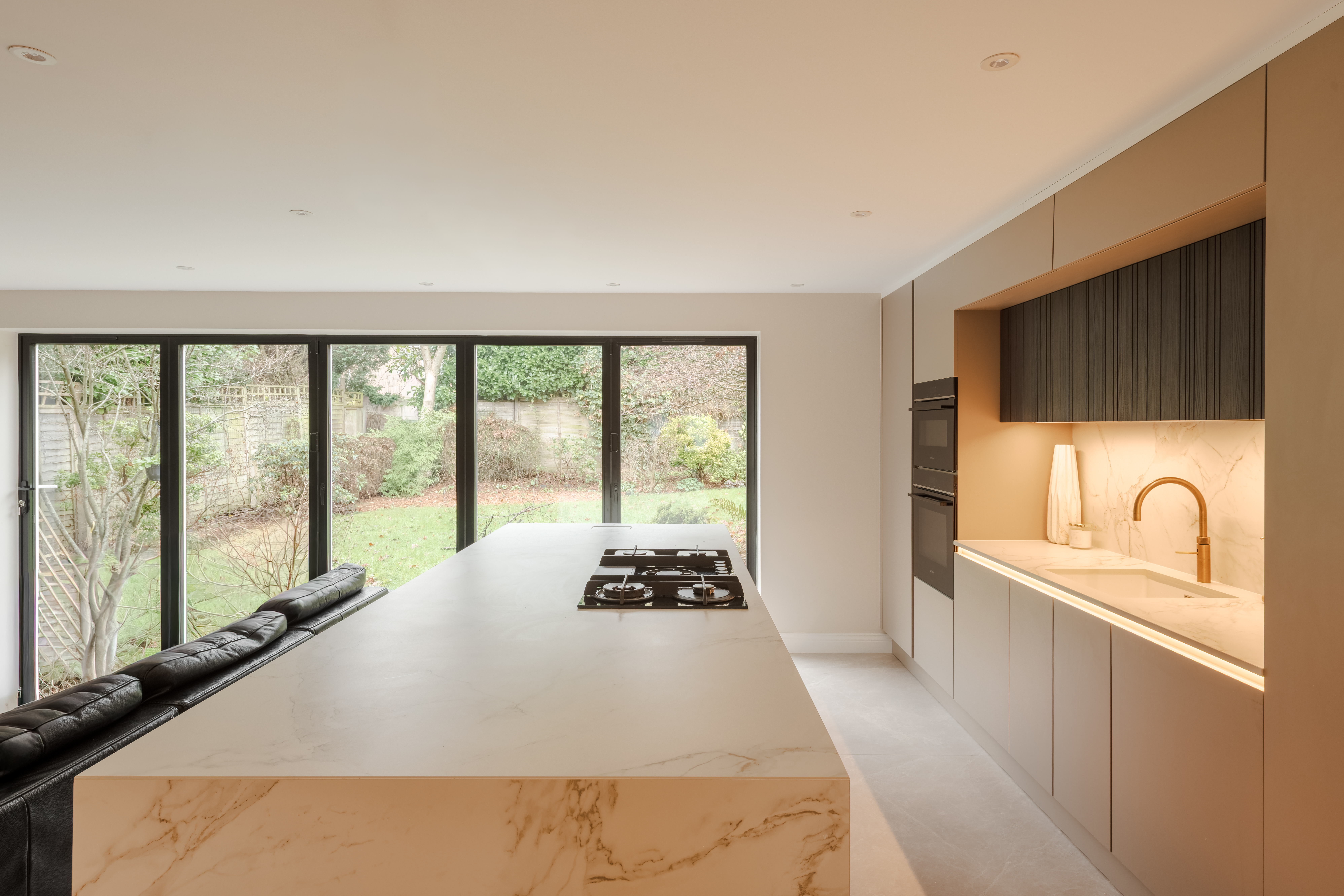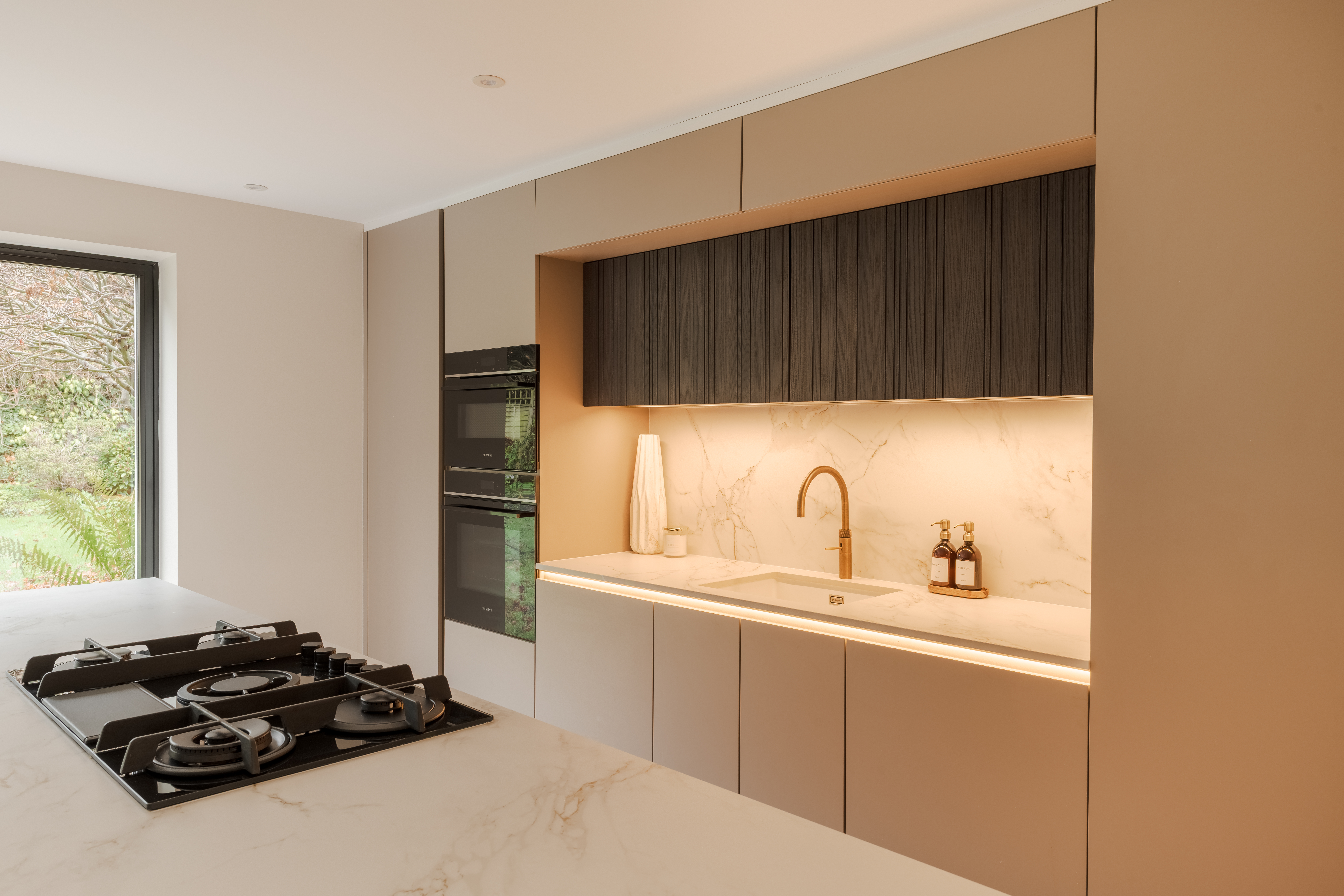 The Dekton Entzo worktop elevates the design with its subtle stone-inspired patterns and durable, low-maintenance surface, providing both visual interest and enduring practicality for everyday use.